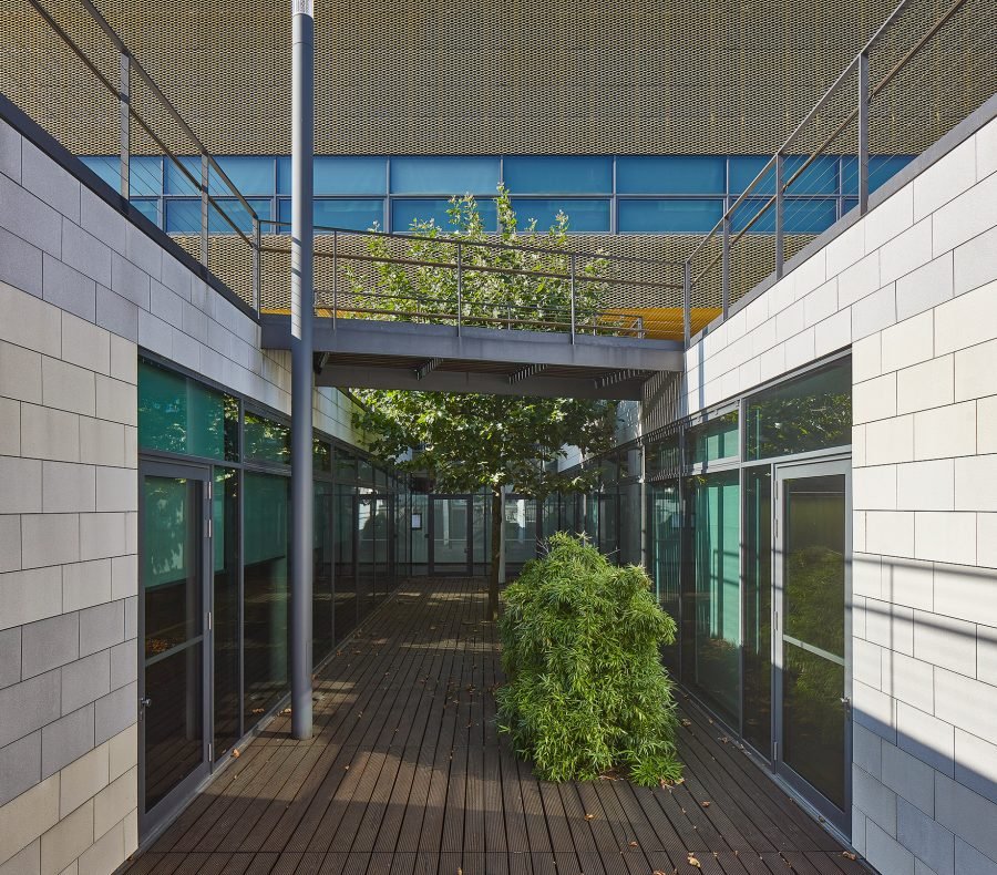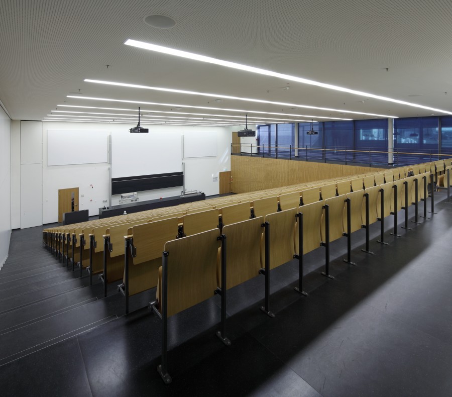 The design, which features an elongated, narrow building, connects the S-Bahn transit station at Riedbergallee to the north of the premises with the round, 3.5 metres lower Max-von-Laue-Straße road to the south. Ground-level entrance is possible from both the north and south ends of the lower floor thanks to a two-storey foyer, which extends over the entire length of the building and opens to generous windows to the east. The foyer is the main backbone of the structure as it connects the buildings’ various purposes. Visitors entering the building from the south can walk directly into the six lecture halls extending eastward under the walkable area on the square. Garden courtyards provide the lecture theatres with light and air. This significantly reduces the building’s visible mass in favour of a generously sized outdoor area structured by inlaid garden courtyards and broad outdoors stairways.