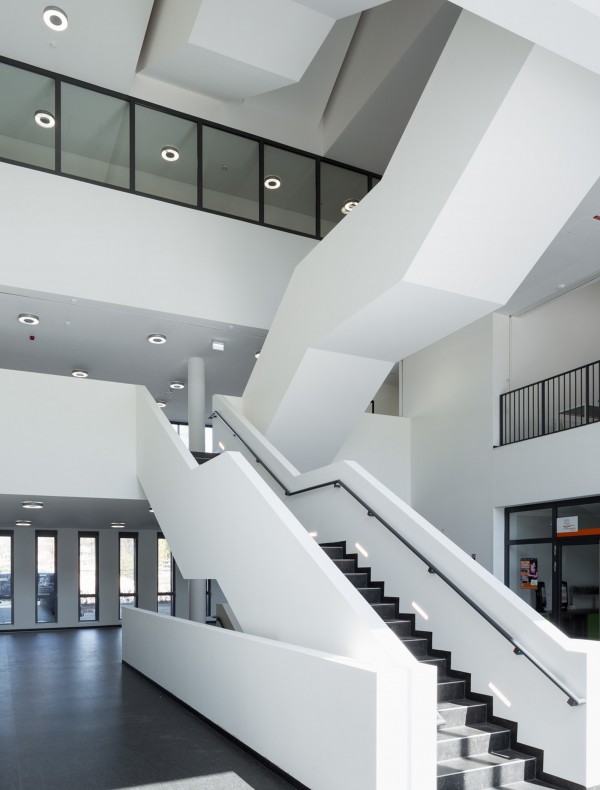 A three-storey building “lies” over the base area and connects the campus to the emerging residential district in the east. The gap between the two building structures containing the foyer, café and exhibition area is a place for gathering and communication. The upper levels are connected to the foyer by a bright, spacious atrium and emphasise the building’s public, interactive character in the vertical.