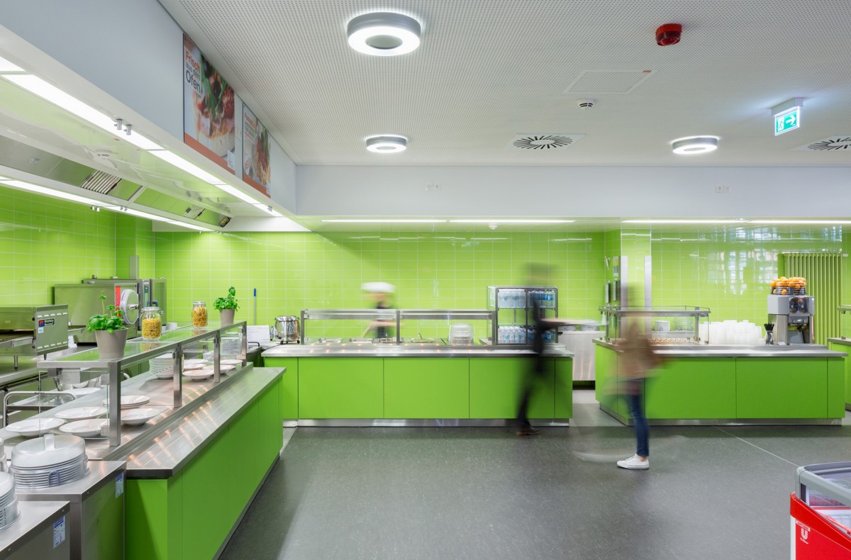 Height differentials on the base towards the Uferstrasse are used to create a large, public café terrace with a view of the Eilbekkanal and campus courtyard. A ramp-platform provides access to the terrace on the side overlooking the shore while a wide staircase is available on the side facing the courtyard. The base houses the community dining hall and a passage from the Uferstrasse to the Finkenau campus.