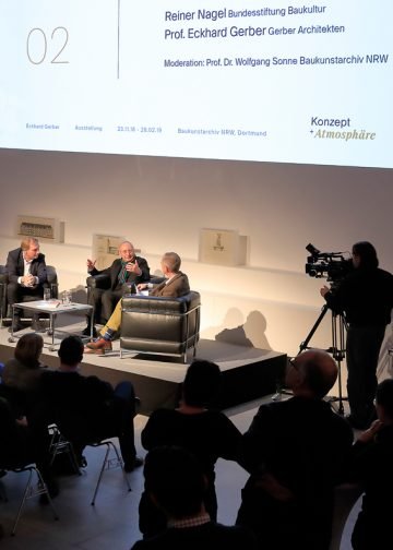 The exhibition was accompanied by three public panel discussions between Professor Gerber and one guest each. Prof. Eckhard Gerber opened the series with talks with Prof. Dr. Volkwin Marg (gmp Architekten) on 28 November 2018 on the parallels in one’s life and finding one’s way to architecture. At the second panel discussion on 9 January 2019, Reiner Nagel, President of the Bundesstiftung Baukultur, was guest at the Baukunstarchiv NRW and talked to Prof. Gerber about the complex aspects of building culture. Prof. Eckhard Gerber concluded the series of talks with Prof. Hinnerk Wehberg, founder of WES LandschaftsArchitektur, on the topic of “Landscape+Architecture”.