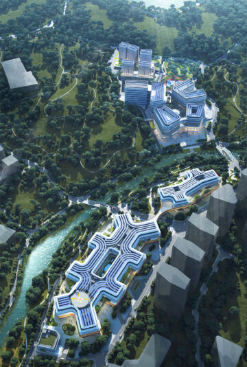 In the metropolis of Shenzhen, southwest of Beijing, a comprehensive healthcare complex is being built, consisting of a university area with a library, a clinic with a training centre as well as residential, leisure and sports facilities. The complex, located between a ridge and a river, is harmoniously integrated into the surrounding landscape. The interplay of topography and architecture incorporates landscape elements into the concept in the form of a green base storey and green façades. The U-shape of the individual building sections creates varied outdoor spaces and a loosened-up internal structure. This network of relationships between interior and exterior spaces means that the healthcare complex contributes to the well-being of staff and patients.