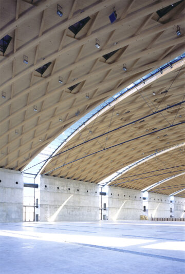 A cantilevered, seemingly weightless roof marks the main entrance to the exhibition centre. Omnipresent visual references ensure easy orientation within the buildings and incorporate the open Black Forest landscape into all areas of the exhibition centre. Arched wooden roof constructions span the four symmetrically arranged exhibition halls without supports.