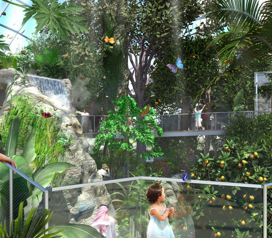 By entering the butterfly dome, the visitor should get the impression of immerging into a tropical rainforest. On the one hand through a visual experience like the high diversity of structures, colours, flowers, light levels, species, a high density, limited space, and on the other hand through the haptic and olfactory experience of high humidity, misting effects, the smell of the soil and fragrance of the flowers and fruits.