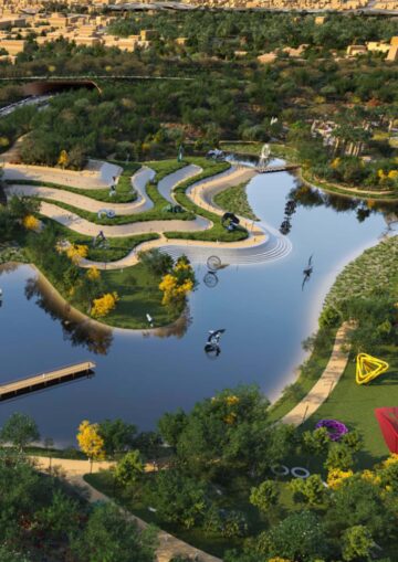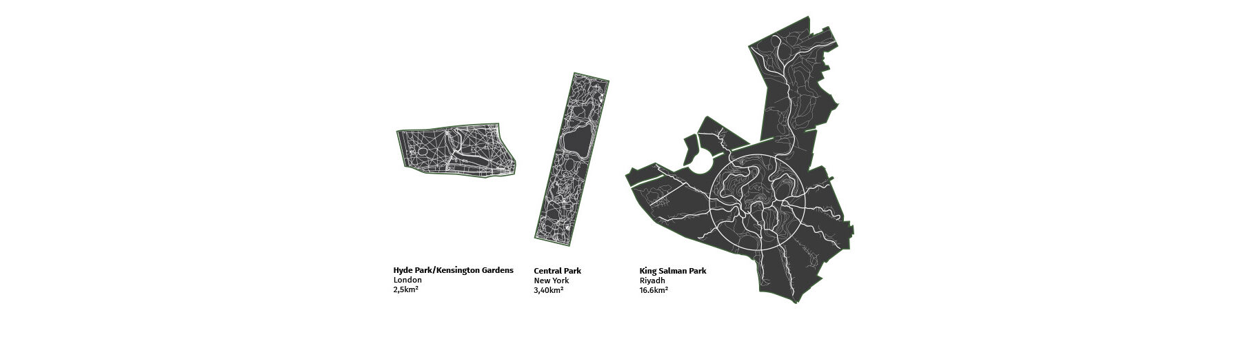 King Salman Park, currently under construction in the heart of Saudi Arabia’s capital, will be the world’s largest inner-city park open to the public. Covering an area of 16.7 km², it is five times larger than New York’s Central Park. The site is the former Riyadh Airport, which is being transformed into an eco-transformative urban renewal project. The park area is accessed via the circular Innovation Loop. Inside this ring lies Central Park, featuring wooded areas, deep wadis, and diverse garden and climate zones. The so-called “green fingers” form a seamless transition to the surrounding city. The organically shaped transition between landscape and urban space highlights the unique character of the public park, which will be accessible around the clock to residents, tourists, and those interested in nature, culture, and sports, offering a novel nature experience in the heart of the urban environment. Interdisciplinary research has made it possible to make the desert soil fertile, ensure a sustainable water supply, and carefully select and plant climate-resilient plants and trees. As a result, King Salman Park will contribute to climate improvement, species diversity, and biodiversity in Riyadh as a sustainable greening project. The park will not only be home to a total of 30 million plants across 800 varieties and 1.1 million trees, but will also offer visitors an ecologically valuable natural and recreational space. Cultural and recreational facilities, such as the Museum of the Earth, the open-air cinema, and the amphitheater, are currently under construction. King Salman Park is a joint venture project with Happold and Setec as planning partners for the overall design, led by Gerber Architekten.