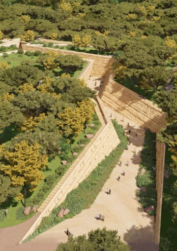 The Park Overlook is situated at the highest point in the park, offering a panoramic view of Central Park’s terraced landscape, which slopes downward toward the center. As the highest point topographically, the Park Overlook serves as a landmark visible from afar within the park grounds. It opens up to the surroundings with large arches and houses a shaded lounge area with water features inside the radially arranged cross vault, inviting visitors to linger. The exposed location offers a panoramic view of the park landscape, which surrounds the viewer on all sides and immerses them in the natural experience.