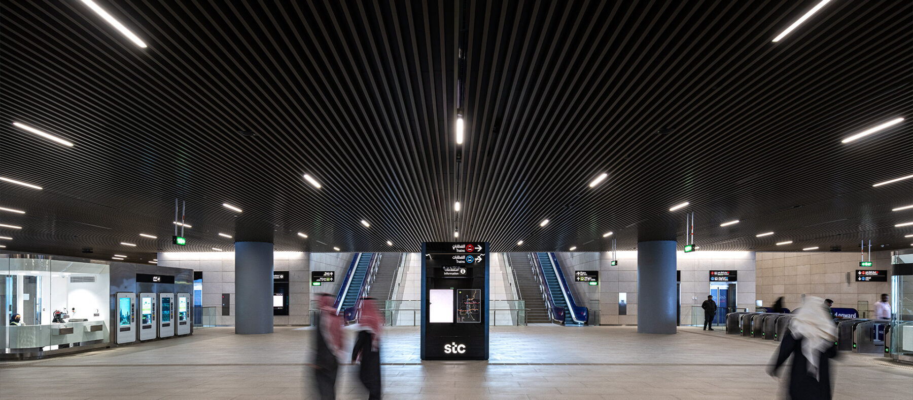 As part of the urban reorganisation of the city centre of Saudi Arabia’s capital Riyadh, a new underground station is being built where the blue and red lines of the underground public transport system cross at right angles to each other. From the resulting four equally sized quadrants of the building, natural daylight penetrates up to almost 30 meters below the city, which should also create underground illuminated spaces. Visually, the station building, with its formation raised from the ground and projecting like a floating rock slab, is inspired by the appearance of rock stratification as seen along the steep slopes outside Riyadh. The building itself occupies only a part of the site, leaving behind a large public square that provides a much-needed green space for the recreation and enjoyment of the people of Riyadh.