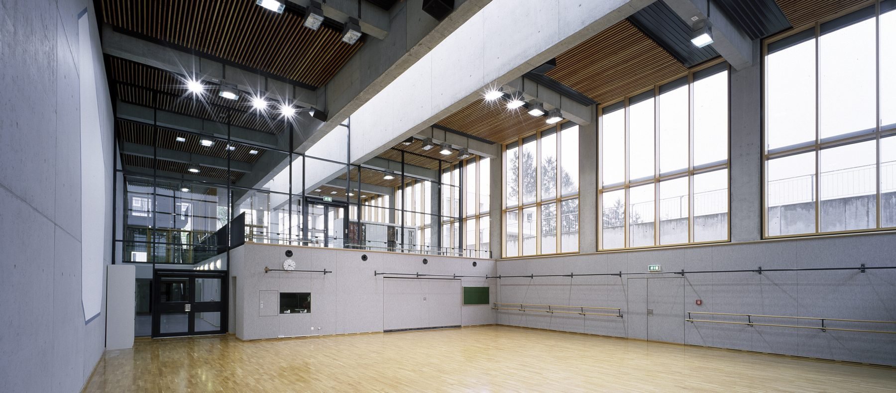 Due to four self-supporting concrete double girders with integrated skylights, the divisibility of the triple sports hall and the multi-purpose hall is easily recognisable. The skylights allow all parts to be independently well-lit during the day. The gym, offices and the seminar rooms of the sports institute are to be found on two levels facing the road. Fair-faced concrete characterises the interior and exterior design.