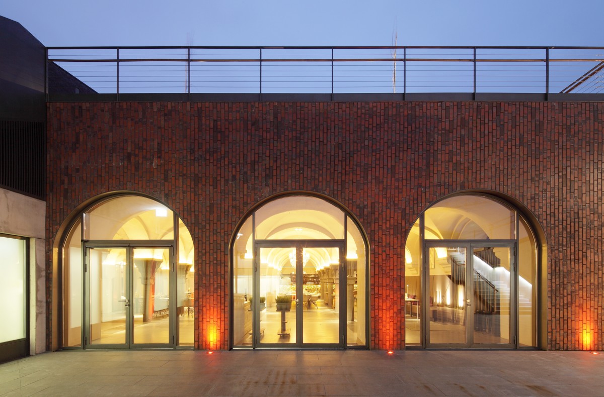Another basic idea of the design was the spatial penetrations from the inside to the outside. These, such as the library on the north side, are formulated as conically warped metal-clad cubatures in counterpoint to the existing red brick façades and refer to the new use of the old listed building. All rooms for administration and workshops are grouped together on the northern outer wall, thus ensuring short internal routes and direct access to the individual exhibition levels.