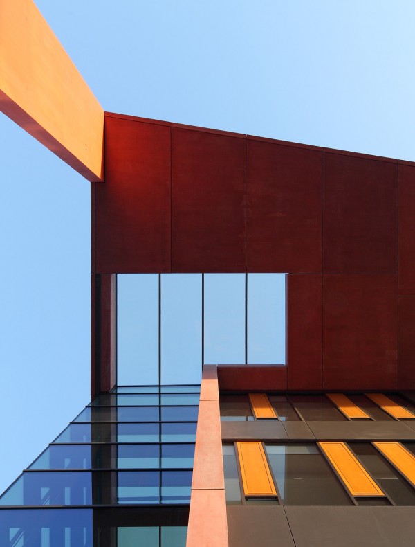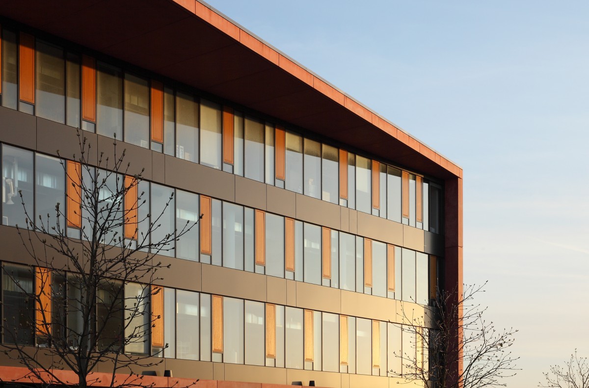 Die Fassaden aus großformatigen Betonelementen mit betonten senkrechten Fugen vor den Laboren und Büros ziehen sich wie ein Band um das gesamte Gebäude und wirken mit wenigen stehenden Fensterformaten weitgehend geschlossen. Die introvertierten Bereiche zu den grünen Innenhöfen sind dagegen als verglaste Pfosten-Riegel-Konstruktion ausgeführt. Insgesamt beträgt der Glasanteil der Außenwände weniger als 40 Prozent, so dass den heutigen energetischen Forderungen Rechnung getragen werden kann.