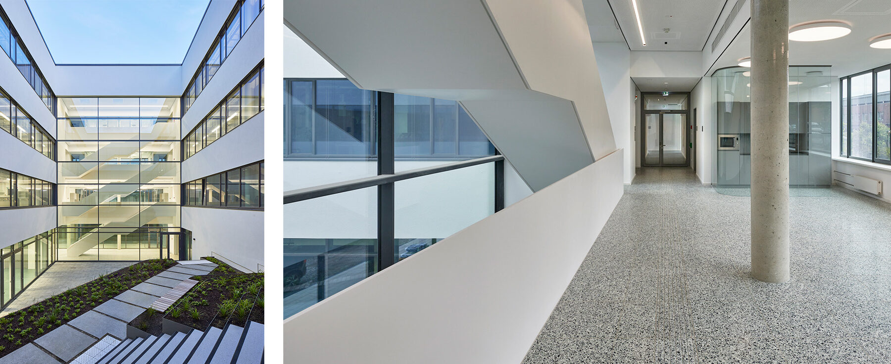 Die Gebäudestruktur spiegelt den dynamischen, interdisziplinären Forschungsansatz wider. Ein zentraler Gartenhof und die geschossübergreifende Halle bilden die visuelle und kommunikative Mitte, um die sich alle Funktionsbereiche gruppieren. Dieses identitätsstiftende Zentrum ermöglicht Mitarbeitern und Besuchern die Orientierung innerhalb des Forschungsbaus.