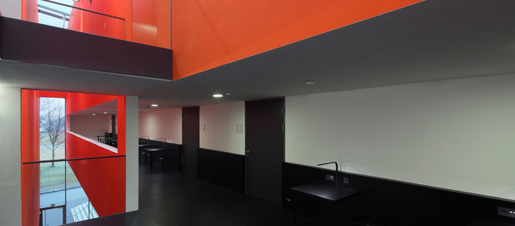 Die markante Farbgebung der Fassade wird im Inneren am Boden wieder aufgegriffen. So führen dunkelgraue Fliesen aus dem Foyer in die verschiedenen Gebäudebereiche. In den Fluren sind zusätzliche Arbeits- und Lernbereiche eingerichtet. Der dunkle Linoleumboden erzeugt eine ruhige Raumwirkung.