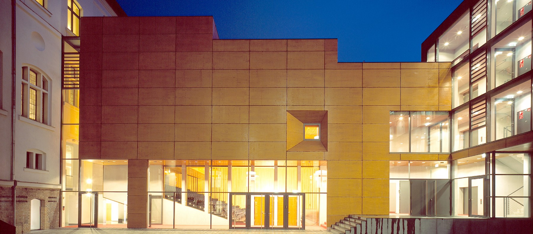 Der neue Saal ist außen und innen mit Holz verkleidet und präsentiert sich anstelle des zerstörten Seitenflügels als zeitgemäße Skulptur eines architektonischen Klangraumkörpers. Im Westen ergänzt ein im Erdgeschoss auf schlanken Scheiben ruhender, ebenfalls holzverkleideter Riegel den Konzertsaal zu einem Gebäudewinkel. Dieser umschließt den bisher ungenutzten Hof und macht ihn zu einem bespielbaren Außenraum mit neuer Aufenthaltsqualität. Die Flure zu den Künstlergarderoben, den Einspiel- und Übungszimmern im neuen Westflügel öffnen sich, ebenso wie der Konzertsaal selbst, über eine Glasfassade zum Hof, der auf diese Weise als kommunikative, identitätsstiftende Mitte der Musikhochschule präsent und erlebbar ist.
