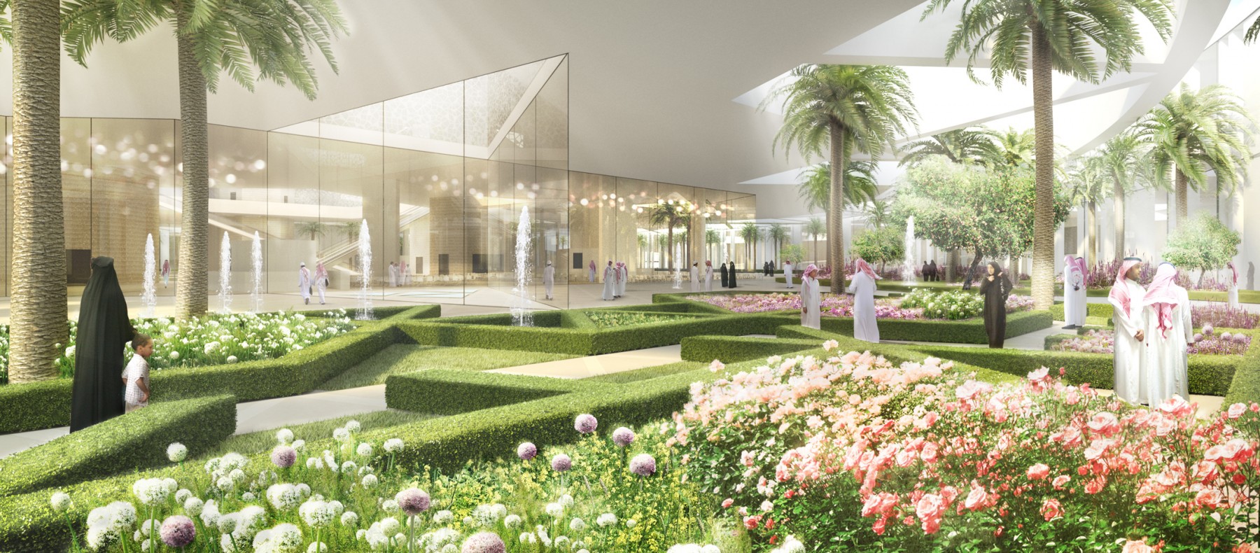 Rezeption, VIP-Lounge, Wartebereiche und Cafés orientieren sich entlang der imaginären „Spaltungsachse“. Eine besondere Bedeutung wird dem direkt nach Mekka ausgerichteten Gebetsraum auf der Museumsebene beigemessen.