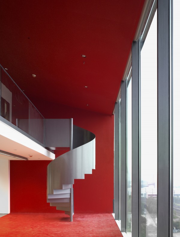 Raumdurchdringungen von innen nach außen, wie die Bibliothek auf der Nordseite, sind als konisch verzogene metallverkleidete Kubaturen kontrapunktisch zu den vorhandenen roten Klinkerfassaden formuliert und verweisen auf die neue Nutzung des alten Baudenkmals.