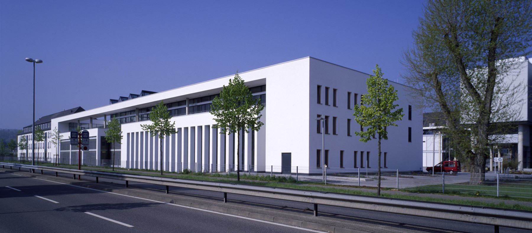 In der Tradition des Bauhauses dominieren weiße Putzflächen die äußere und innere Gestaltung. Im Gegensatz zu den Pfosten-Riegel-Konstruktionen der zentralen Halle und der Gebäudefugen sind die Lochfenster als Holz-Glas-Elemente ausgebildet, so dass sich ein spannungsvolles Zusammenspiel geschlossener und offener Flächen ergibt, die sich zu einer harmonischen Gesamtfassade fügen.
